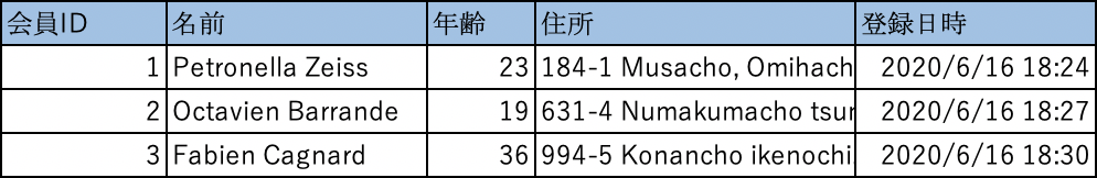 これらがテーブルを構成する列です。会員IDは行を特定するための値なので「主キー」です。
