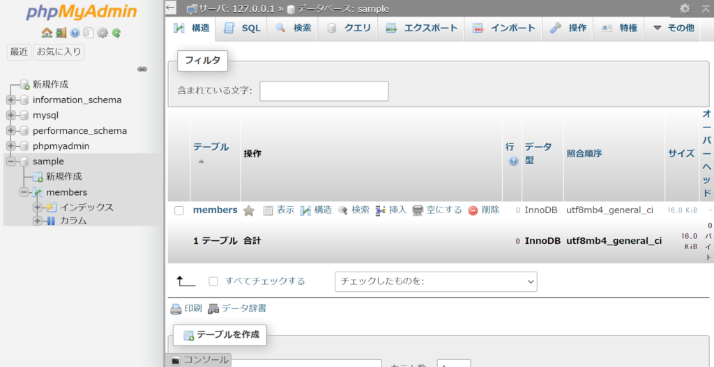 );実行すると左側のデータベース一覧のsampleデータベースの中に、membersテーブルが作られました。