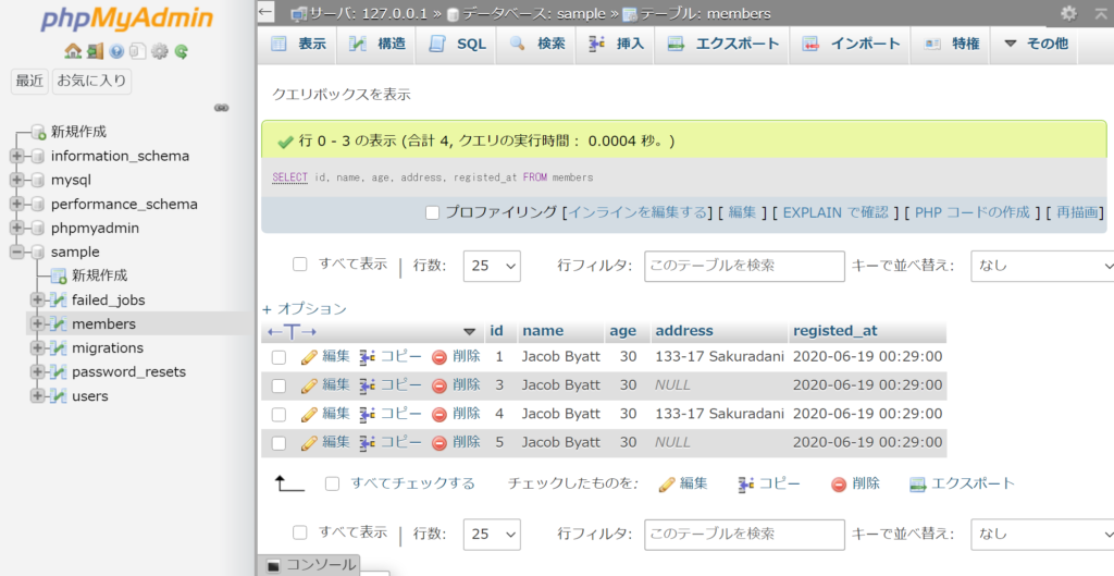 前回の記事で使ったmembersテーブルからレコードを取得してみましょう。