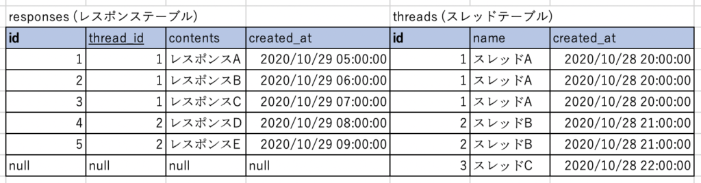 SELECT * FROM threads RIGHT JOIN responses ON threads.id = responses.thread_id;